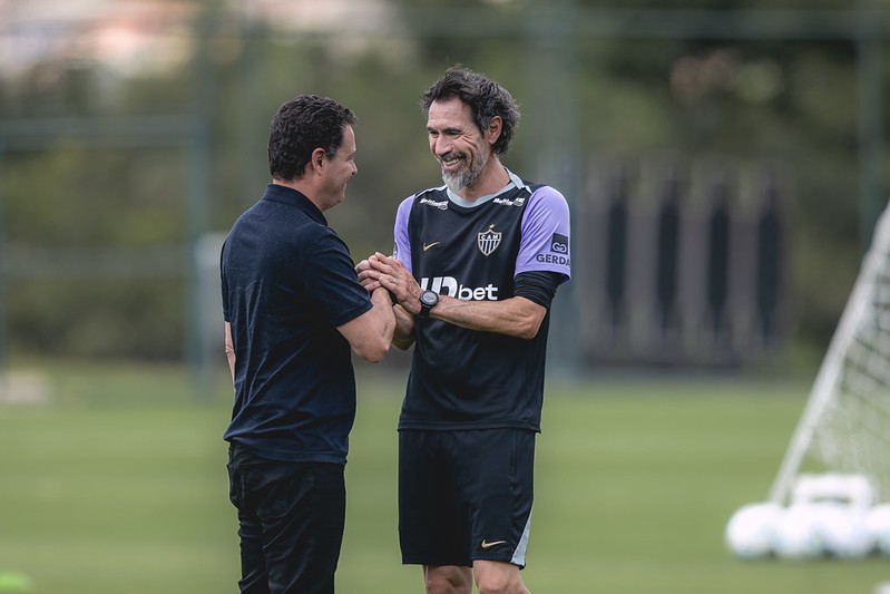 Acionista majoritário da SAF do Atlético, Rafael Menin acompanhou o treino e foi registrado ao lado de Domínguez em uma das imagens. O dirigente já esteve no CT em outras ocasiões, acompanhando atividades do grupo.
